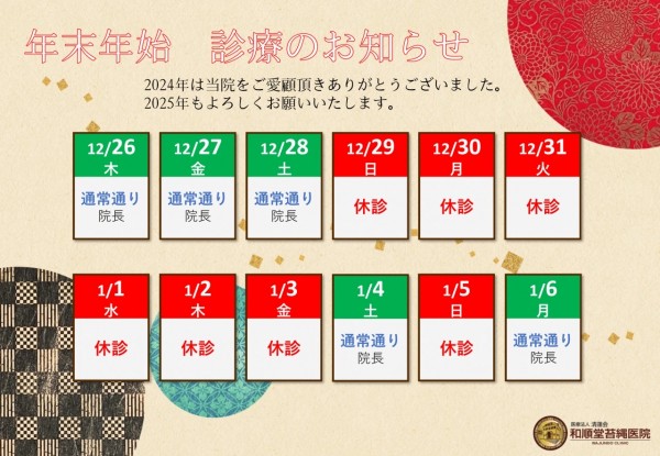 年内は12月28日(土)が年内最終診療日となり、終日診療しております。