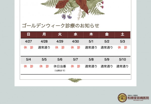 2025年ゴールデンウィーク期間中の診療日と休診日をお知らせいたします。ゴールデンウィーク期間中に患者さまへの継続的な医療の提供に支障が生じないよう、下記の日程で診療いたします。尚、5月6日(火)は上郡町の休日診療当番医となります。何卒、ご理解ご協力いただけますようよろしくお願い申し上げます。