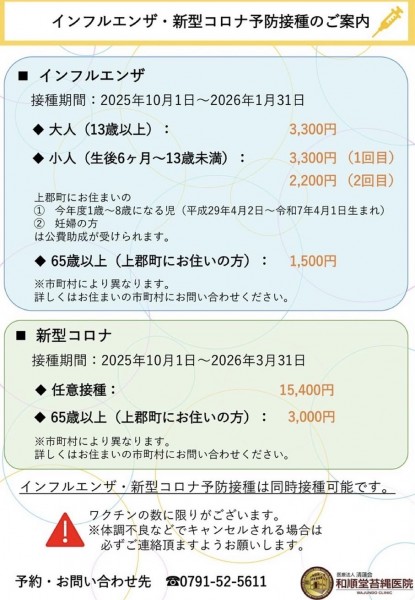 = インフルエンザ・新型コロナ予防接種のお知らせ =2025年10月1日よりインフルエンザ・新型コロナ予防接種が始まっております!<インフルエンザ>◆大人(13歳以上):3,300円◆小人(生後6ヶ月~13歳未満):3,300円(1回目)2,200円(2回目)◆65歳以上:1,500円(お住まいの市町村により異なります)<新型コロナ>◆任意接種:15,400円◆65歳以上:3,300円(お住まいの市町村により異なります)インフルエンザ・新型コロナ予防接種は同日接種可能です。※ワクチンの数に限りがございます。体調不良などでキャンセルされる場合は必ずご連絡頂きますようお願いいたします。予約・お問合せ先:0791-52-5611https://www.wajundo.com #医療法人清蓮会 #和順堂苔縄医院 #和順堂記念医院 #苔縄 #智頭急行 #鳥取 #上郡 #三ノ宮 #京都 #大阪 #智頭 #明石 #相生 #姫路 #龍野 #赤穂 #岡山 #スーパーはくと #佐用 #大原 #胃カメラ #大腸カメラ #漢方 #プラセンタ注射 #グルタチオン注射 #高濃度ビタミンC点滴 #アンチエイジング #インフルエンザワクチン #新型コロナワクチン